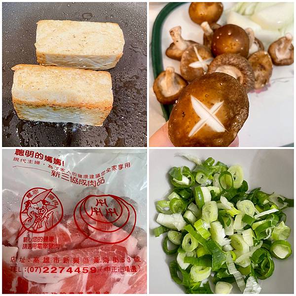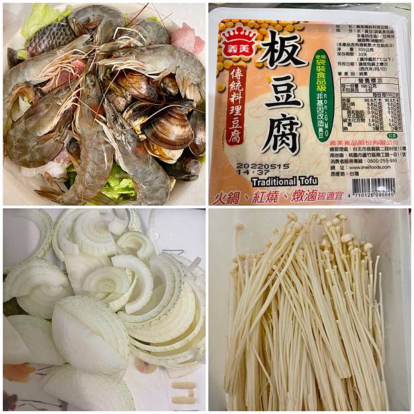首先準備的材料有:冰箱撈出的海鮮、火鍋豬肉片(比較沒有煮太老的問題)、蔥少許、洋蔥、香菇、板豆腐(煎至金黃切片備用)、貢丸、蔬菜🥬